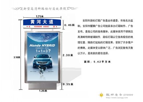 户外灯箱广告牌一般就要具有吸引路人的关注目光,增强展示的逼真效果,渲染产品气息,诱导消费者的购买欲,强化广告宣传的特殊印象的作用。 灯箱广告又名“灯箱海报”或“夜明宣传画”。用于户外的灯箱广告,其应用场所分布于道路、街道两旁,以及影(剧)院、展览(销)会、商业闹市区、车站、机场、码头、公园等公共场所。国外称之为“半永久”街头艺术。